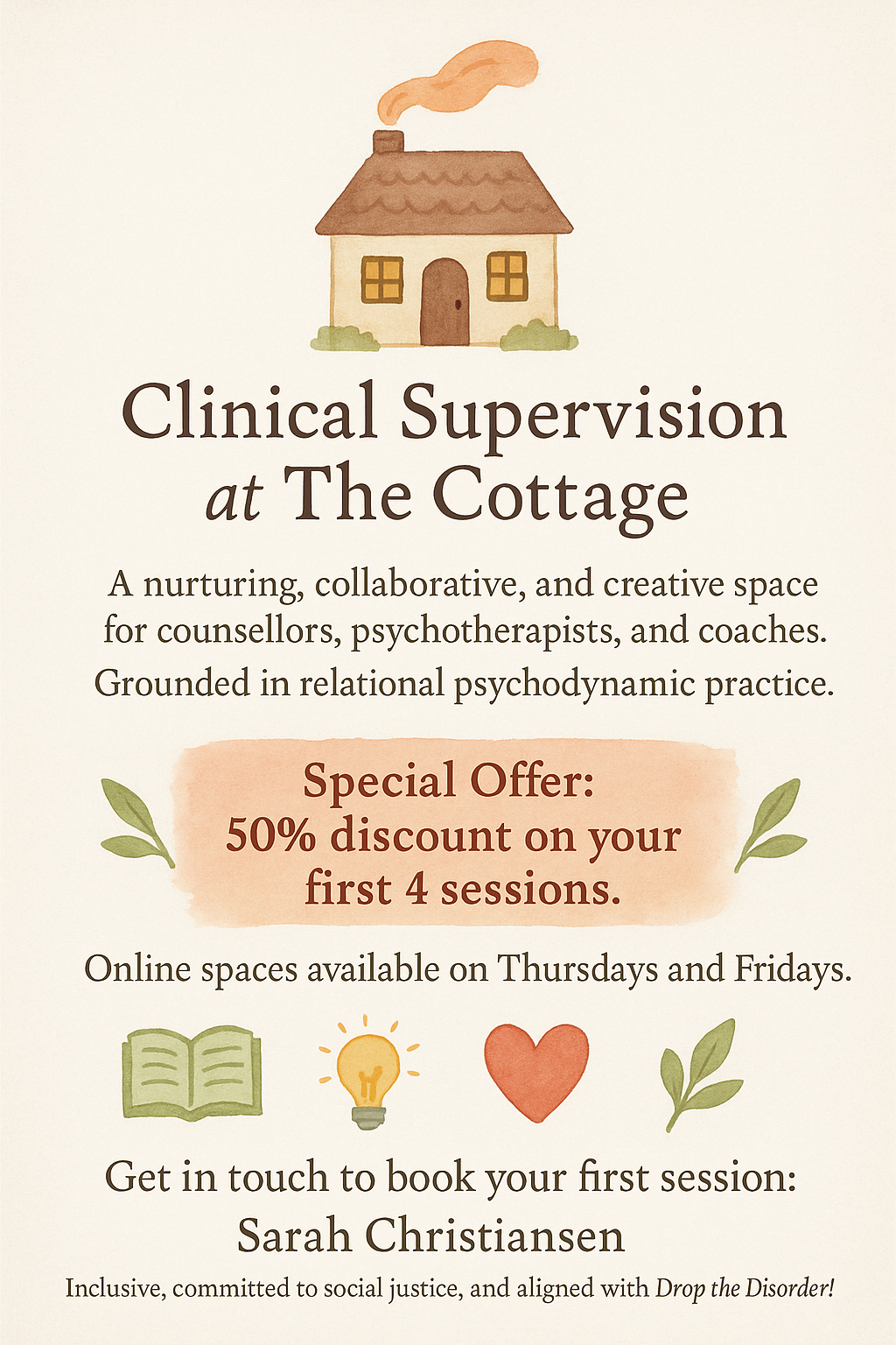 I am not currently taking on new clients, however I do have some spaces for clinical supervision.